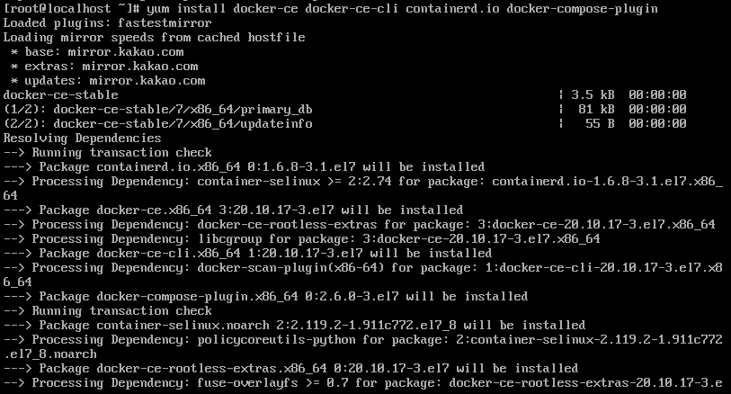 $ sudo yum install docker-ce docker-ce-cli containerd.io docker-compose-plugin
