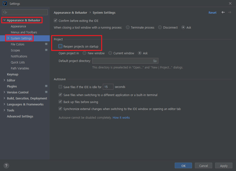 | IntelliJ(인텔리제이) 최근 프로젝트 자동 열기 설정 (0) | 2023.03.08 |