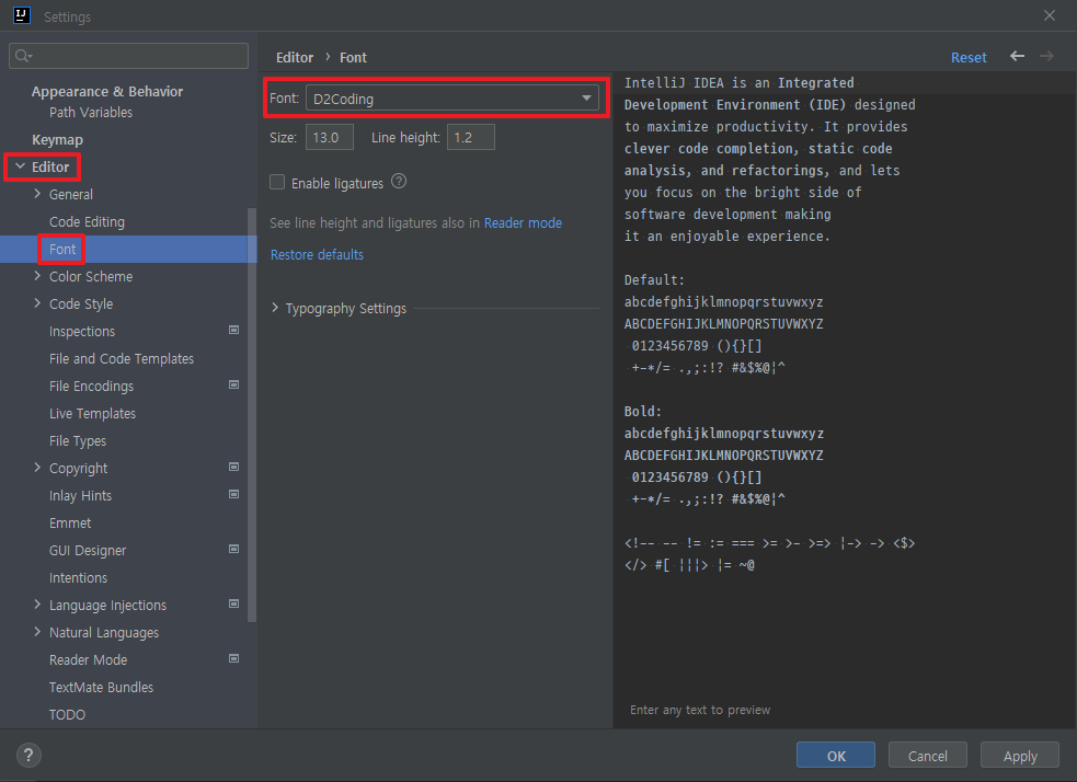 Editor -> Font -> Font -> 글꼴선택