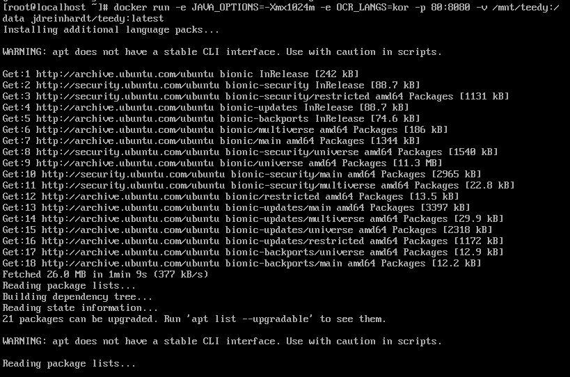 Advanced: docker run -e JAVA_OPTIONS=-Xmx1024m -e OCR_LANGS=kor -p 80:8080 -v /mnt/teedy:/data jdreinhardt/teedy:latest