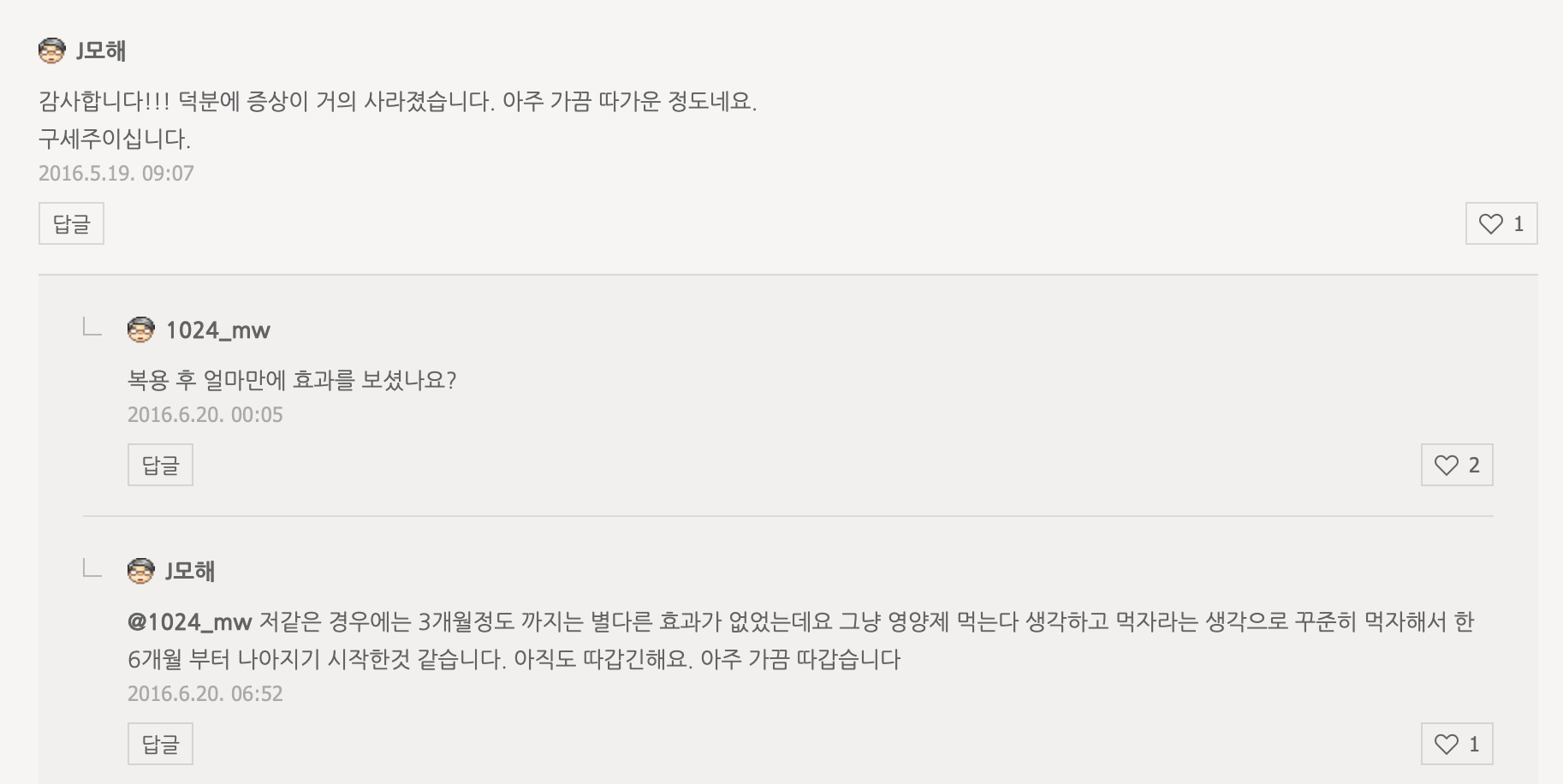 몇 개월 동안은 정말 이게 효과가 없어서 맞나?라는 의심이 들었으나, 그냥 영양제 하나 먹는다는 생각으로 6개월쯤 먹으니 효과가 나왔습니다.