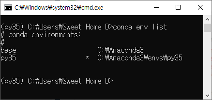 아래와 같이 명령어를 실행하면 프롬프트 앞에 가상 환경 명칭이 붙습니다.